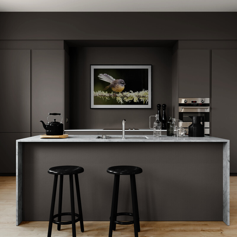 The dark background frames this tail-flirting pīwakawaka on a cold, wet Dunedin winter’s day.