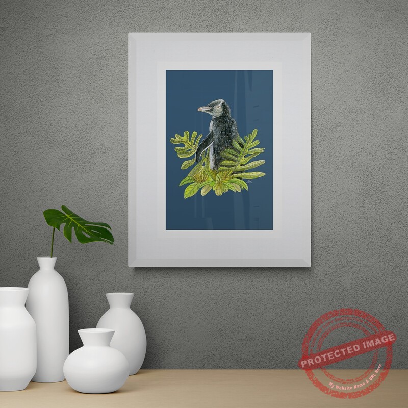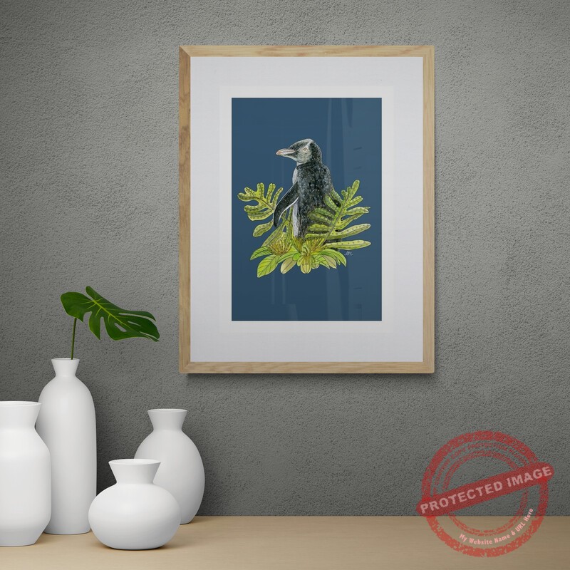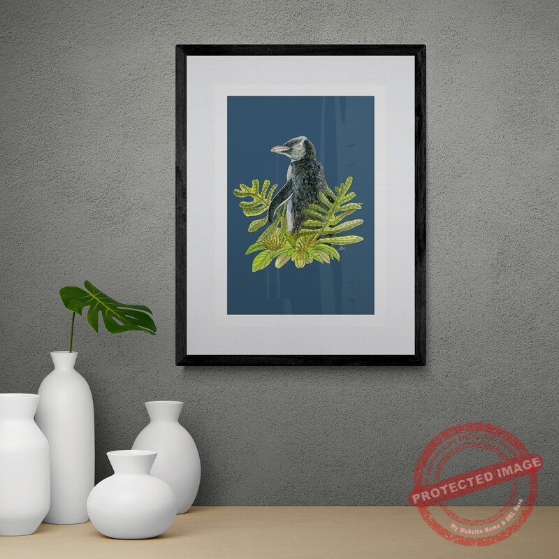 Yellow-eyed Penguin + Rata’ features a Yellow-eyed penguin, also known as a Hoiho, alongside ferns and rata flowers. Oringinal artworks is created using acrylic paint and an Indian ink pen and the print is digitally signed.